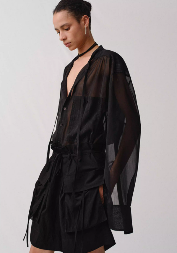 Snow Ribbon draws inspiration from soft winter light and flowing movement, combining the delicacy of chiffon with the structure of a shirt jacket. The design balances femininity and modern tailoring, creating a piece that feels airy yet refined. The tie-neck detail adds a graceful focal point while maintaining a clean and contemporary silhouette.